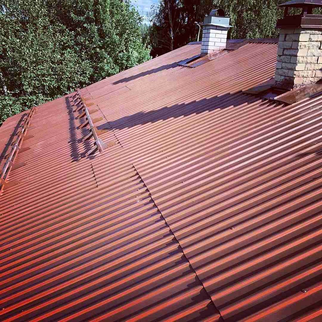 • Покраска кровли 2 раза в сутки. Это окончательная стадия наших работ. После выполнения грунтовки, следует дождаться ее полного высыхания, а после приступать к покраске в 2 подхода. Кроме того, выдерживается определенный промежуток времени для высыхания 1-го слоя. Материалом для окрашивания будет краска, которая предназначена специально для металлических поверхностей. Одна из наиболее востребованных красок ПФ-021. Цветовая гамма подбирается с учетом требований и пожеланий клиента, или мы отталкиваемся от цвета прежнего покрытия.